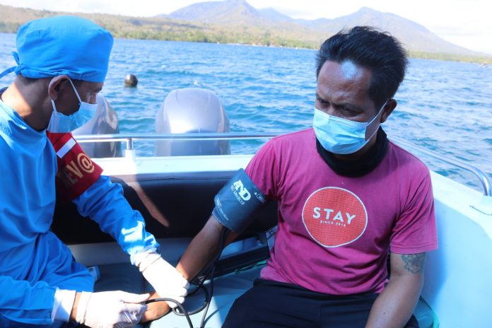 BULELENG – Trobosan gerai vaksinasi terapung Polri kini kembali menyasar di perairan laut teluk terima Desa Sumberkelampok, Kecamatan Gerokgak, Buleleng. Antusias dari nelayan pun begitu terlihat sehingga sebanyak 21 orang nelayan telah mengikuti vaksinasi, pada Kamis (26/8/2021).