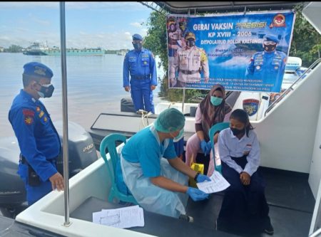 Sampit -Personel Direktorat Kepolisian Perairan dan Udara (Ditpolairud) Polda Kalteng Markas Unit (Marnit) Samuda komandan KP.XVIII-1008 dan KP.XVIII-1014 melaksanakan vaksinasi kapal presisi terhadap pelajar SMP dan SLTA yang berada di Kecamatan Pulau Hanaut Kabupaten Kotawaringin Timur, Senin, (6/09).